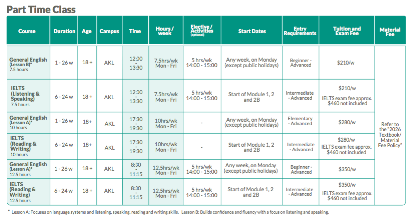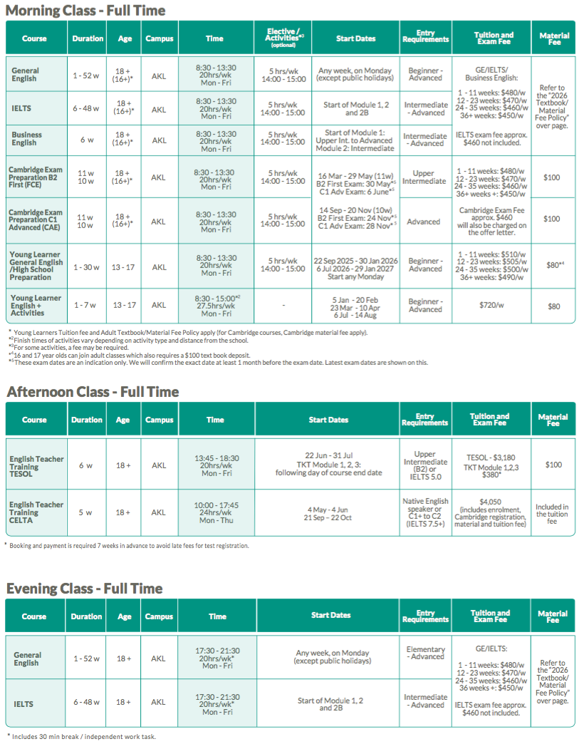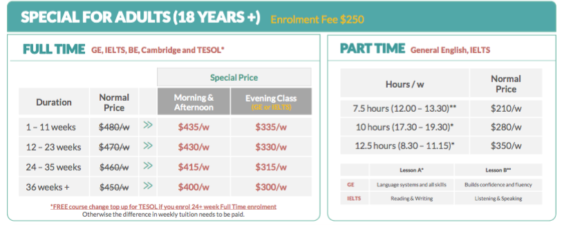 | 授業料 | $510/週 (1-11w), $505/週 (12-23w) |