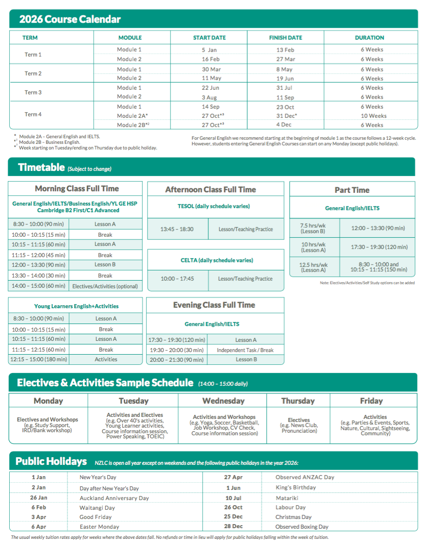NZLCの一般英語コースは、初心者も上級者も自分のレベルでしっかり学べるようにコースを構成しています。英語の知識とスキルの向上、コミュニケーションを重視した実践的な内容の授業が、資格を持ち協力的でフレンドリーな教師陣により学生が楽しんで学べるように行われています。定期的な英語力の進歩度合いを測るテストとアカデミックカウンセリングで、学生さんの目標の達成を手助けできることを目指します。