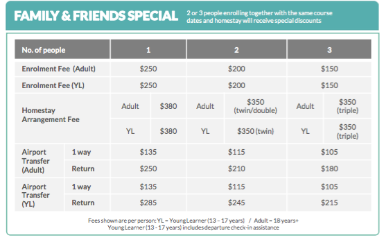 | ホームステイ滞在費(1週間料金) | $380($54.28/泊) | 平日2食:$405 平日3食:$445 *13歳は別料金 |