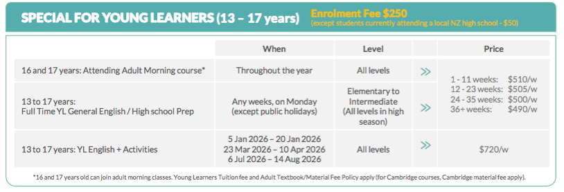 ヤングラーナーの英語学習にも力を入れており、13歳から17歳の学生さんも受講出来るコースを開講しています。現地の高校への入学の準備を行うコースと英語+アクティビティのコースが実施されています。英語+アクティビティのコース午前中に教室で英語のクラスがあり、午後は世界中から来ているクラスメートとニュージーランドの文化に触れたり生活を楽しみながら、英語力の向上を図ることが出来ます。