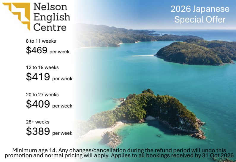 - プログラムに含まれるもの:入学手数料、ホームステイ手配料、ホームステイ滞在費、通常英語午前クラス(月曜~金曜 9:00 より 12:15 まで)(1 クラス最大 6 名まで)、午後のアクティビティプログラム(月曜~木曜 13:00 より 15:15 頃まで (目安)、 週末のアクティビティプログラム、到着日及び出発日のネルソン空港から/への送迎