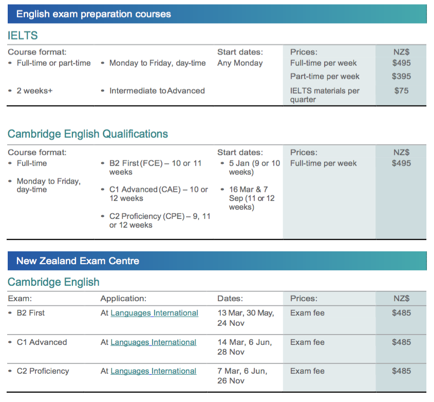 試験対策コースは以下の3コースが開催されています。IELTSコースは毎週入学が可能ですが、Cambridgeコースは開催日と期間が決まっていますので注意が必要です。通常、1クラス最高12名までです。 Intermediate(中級)レベルの英語力が必要です。たくさんのIELTS関連などの試験対策用の教材もLearning Cerntreに準備されています。