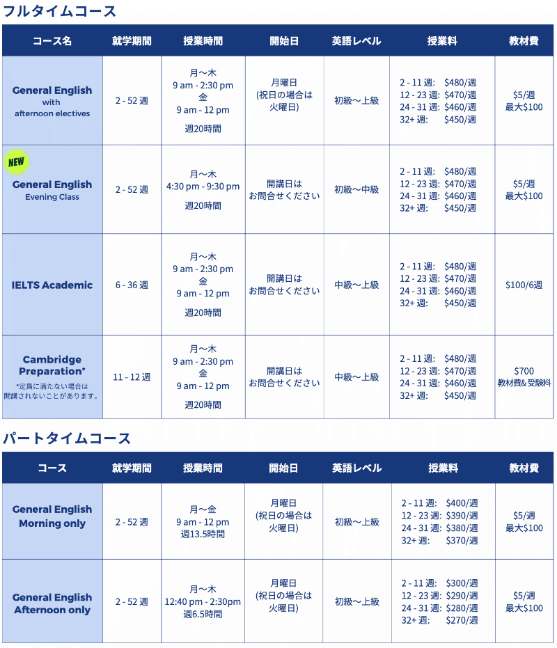 | テキストブック | 一般英語:$5/週(最大$100) IELTS: $100/6週 Cambridge: $700(教材費+受験料) |