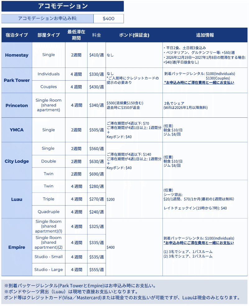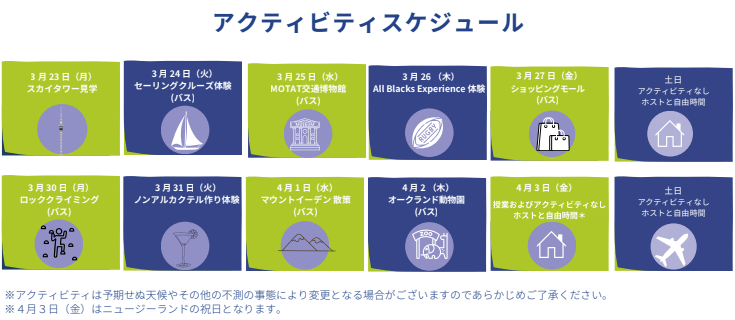 | パッケージに含まれるもの | 入学金、授業料、アクティビティー費用、ホームステイ(3食)、教材費、 往復空港送迎、海外旅行保険、ATバスカード(バス代込み)、SIMカード |