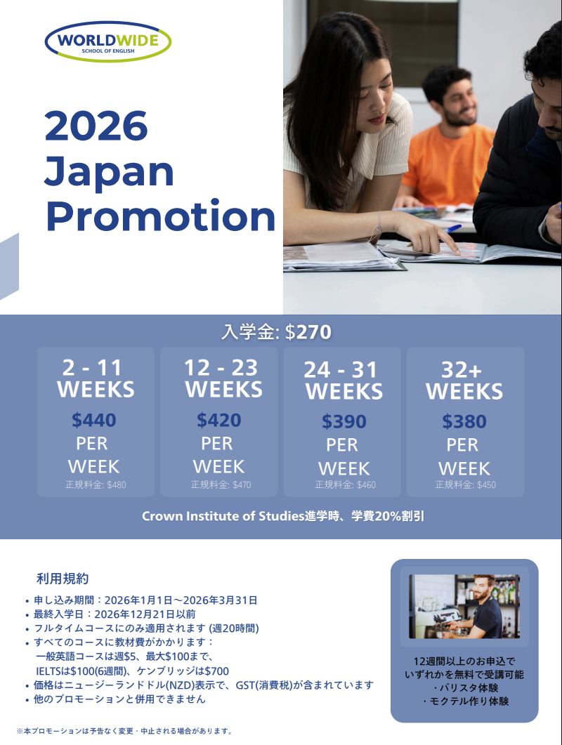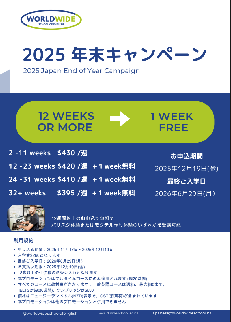 ※ 上記規定は学校のキャンセル規定です。当ニュージーランド留学情報センターは、学校の規定を最優先とし、その後、当社のキャンセル規定が適用されます。ご了承下さい。