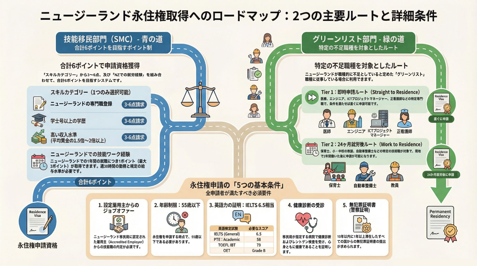 Green Listに掲載がある職業にニュージーランドで就いている場合、永住権申請が可能になります。仕事の求める資格や条件をクリアし、労働・給与条件でのジョブオファーが条件で申請が可能になるTier1と言うカテゴリーの「Straight to Residence Visa」と、仕事の求める資格や条件をクリアし、現地での規定の労働・給与条件での職歴(24ヶ月)が必要になる、Tier2と言うカテゴリーの「Work to Residence Visa」に分かれます。